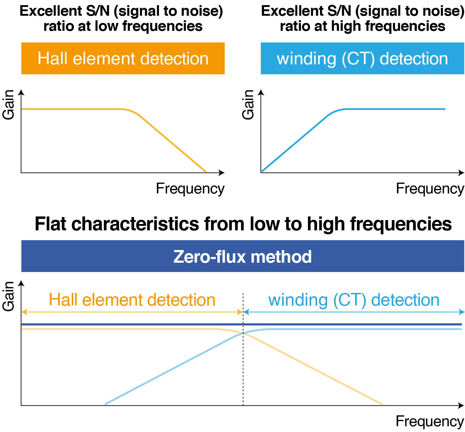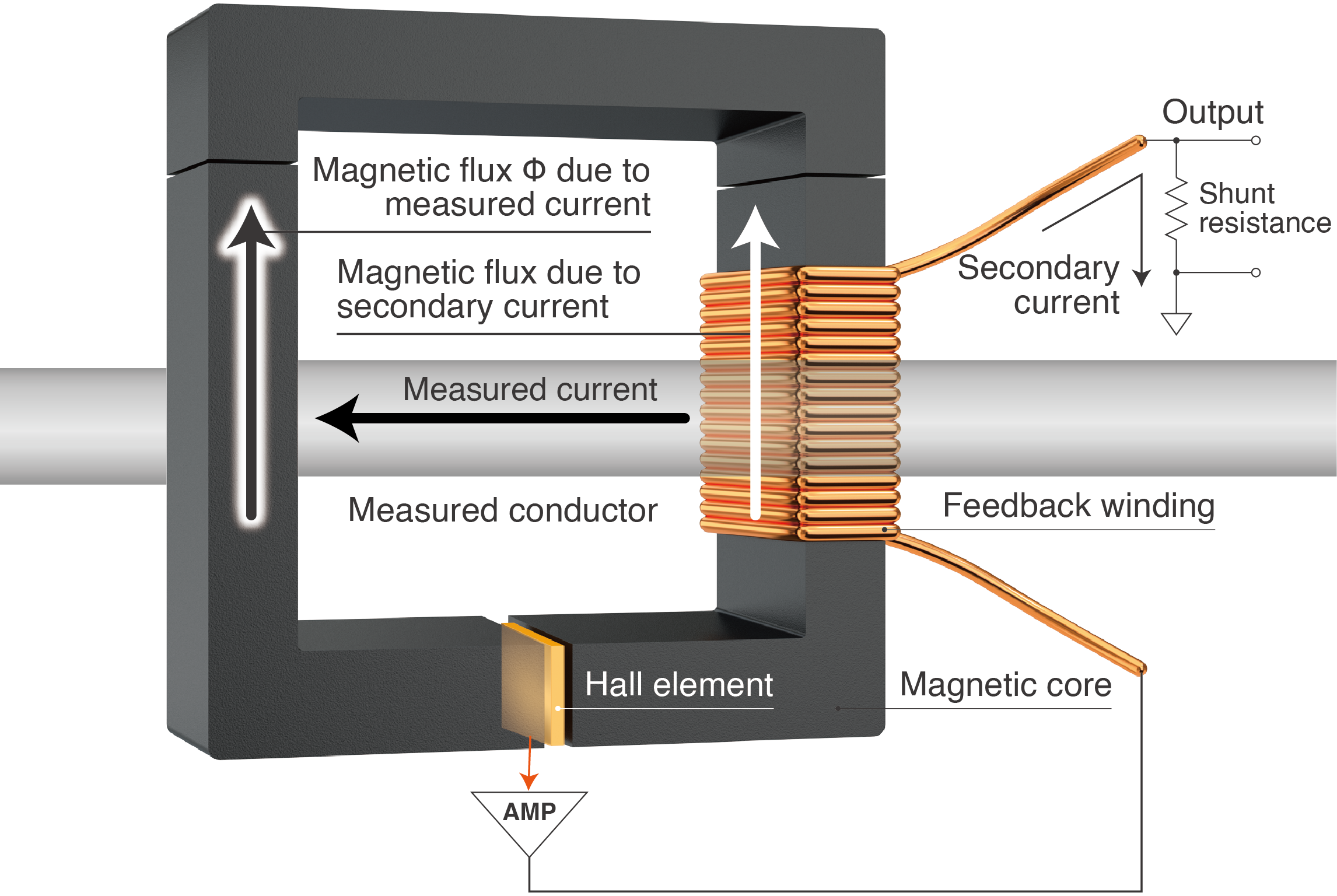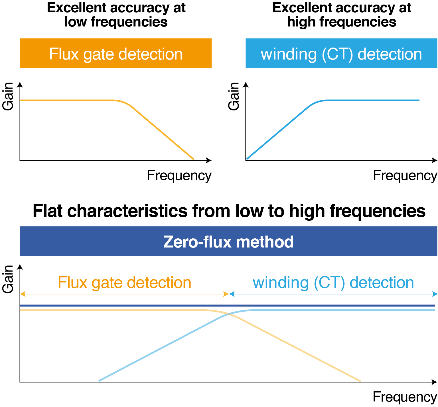 The two much more relevant zero-flux current sensor technologies are the ones that allow for the measurement of both AC and DC currents. In that case, DC and low frequencies are detected either with a fluxgate or a hall element.