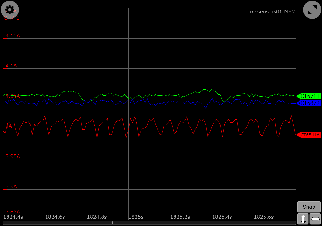 To record and compare the measured currents over a longer period of time, I connected them to a HIOKI MR6000 memory recorder. The CT6711 hall sensor based current probe has a BNC output as it is typically used with oscilloscopes or recorders. For this measurement I picked a high resolution unit for the MR6000 recorder called “8968” which offers a 16bit resolution. HIOKI’s MR6000 memory recorder has a hardware option that provides the necessary power to drive the CT6711 or other current sensors with a 2-pin Lemo power supply connector. To use the CT6711 with an oscilloscope, a power supply unit is needed like HIOKI’s 3269 or 3272.
