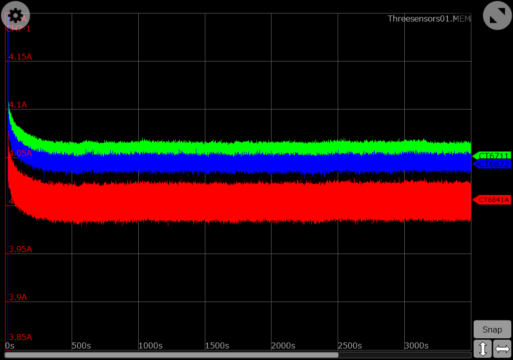 But as you can see there is no drift. Not at all. What you can see is that I have missed to zero-adjust the channels before starting the recording, which especially causes the CT6841A (red curve) to be displayed a little next to the other two measurement curves. While this was not intended, in this case it probably even helps to show that there are three curves on display. Because the CT6872 (blue curve) is hidden behind the curve of the CT6711 (green curve), here is the same recording with the CT6872 in front.