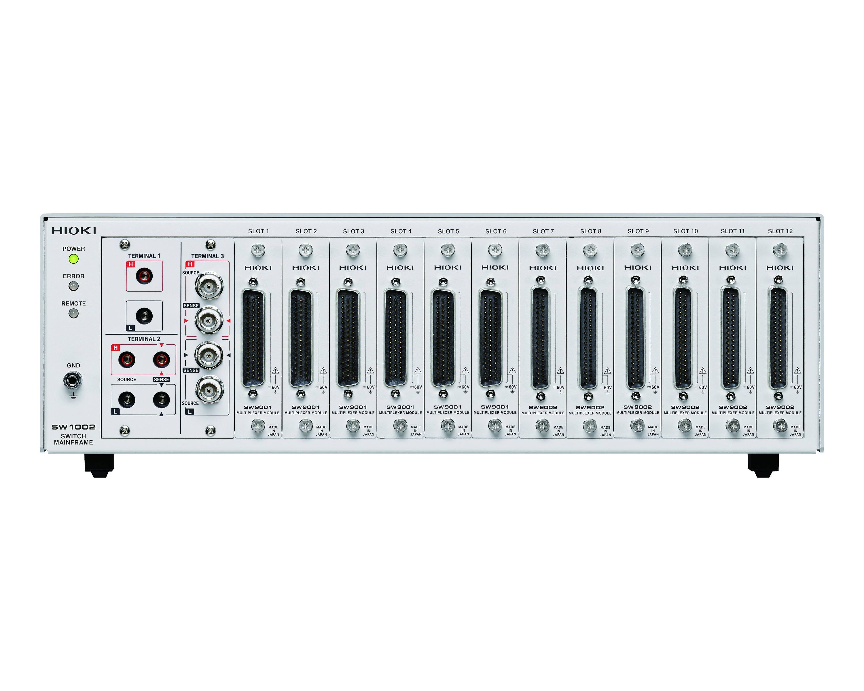 In this case, the use of a separate multiplexer system is recommended. HIOKI offers such a system in various versions, and in a configuration designed for 4-wire measurements it enables the control of up to 132 channels with a single measuring device such as the RM3545 (configuration: SW1002 + 12 × SW9001). The multiplexer unit is not limited to the use with resistance meters, but can also be used with HIOKI‘s battery testers, impedance meters or voltmeters – provided the measured voltages are below 60 V.