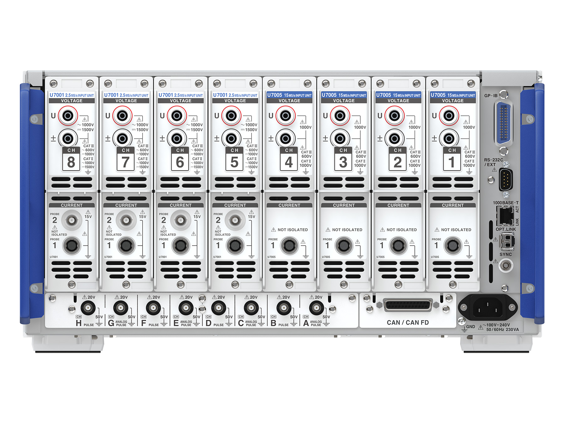 The U7005 High Bandwidth input unit offers ultimate precision with ±0.03% basic accuracy, a sampling frequency of 15 MHz, 18-bit A/D conversion and a maximum input voltage of 1000 VAC. It is suitable for applications such as efficiency measurements of SiC and GaN based inverter motor drives, and accurate inductor loss measurement of inductors under load. Excellent resistivity for external noise of 110 dB at 100 kHz, ensure accurate and stable results even in the proximity to high frequency power switching semiconductors.Automatic Phase Shift Correction and Power Spectrum Analysis