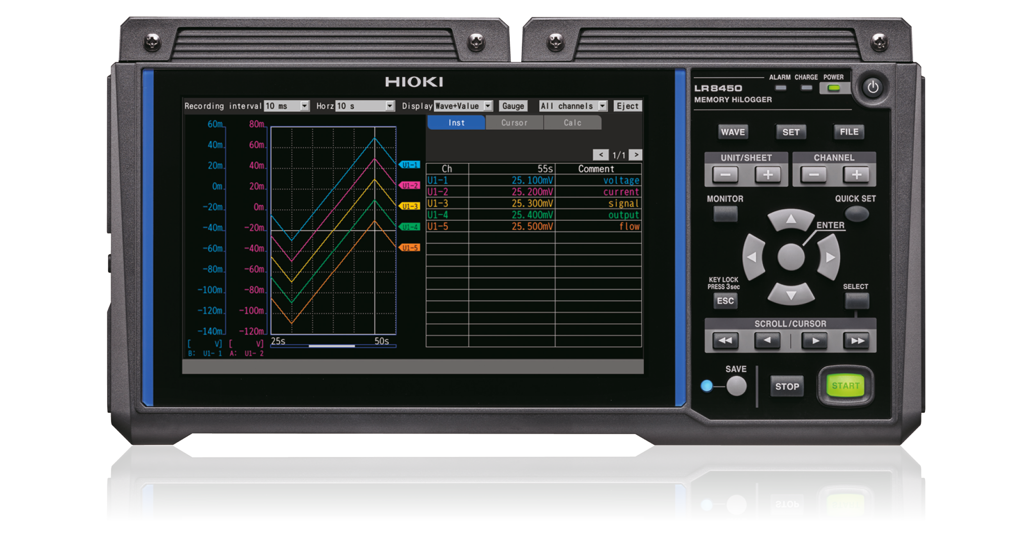 The high-speed LR8450 data acquisition system supports up to 120 channels with four plug-in modules, expandable to 330 channels by adding seven wireless modules5. In combination with a wide range of measurement modules it is the ideal tool for both simple and complex applications.